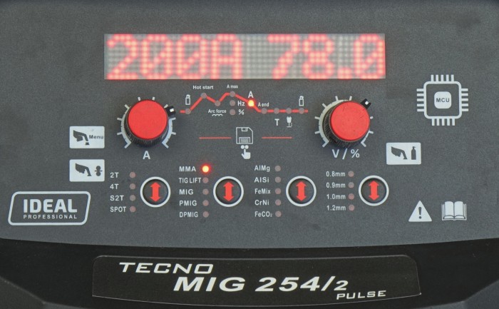 Czytelny i prosty w obsłudze cyfrowy panel sterowania umożliwia dokładną regulację parametrów spawania MIG takich jak :