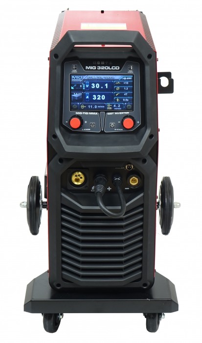 Profesjonalny synergiczny półautomat spawalniczy do spawania metodą MIG-MAG drutem spawalniczym w osłonie gazu oraz metodą MMA oraz TIG LIFT. Prąd spawania 300A. Zasilanie 400V. Średnica drutu spawalniczego 0,8-1,2mm. Podajnik drutu 4-rolkow