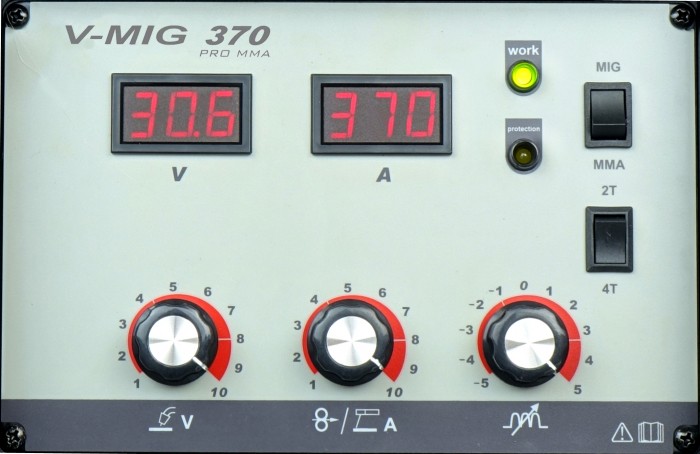 V-MIG 370 wyposażony jest w miernik cyfrowy (woltomierz, amperomierz) co pozwala na bieżąco kontrolować parametry spawania.