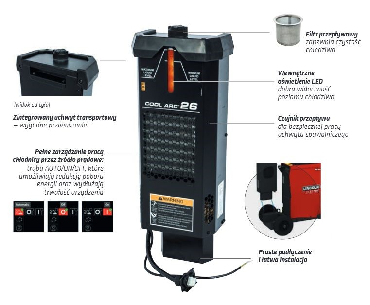 - Chłodnica Coolarc 26 w zestawie – umożliwia spawanie z maksymalną wydajnością.