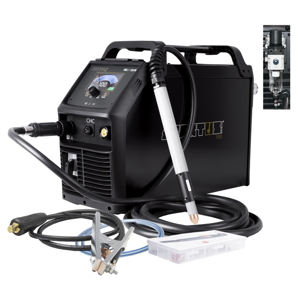 Wyposażenie pakietu: • ProCUT 125CNC • Uchwyt SPARTUS® 100H 6m • Niezbędnik plazma z częściami palnika • Filtr powietrza z regulacją ciśnienia • Przewód masowy 3m • Wężyk powietrzny z opaskami • Instrukcja obsługi